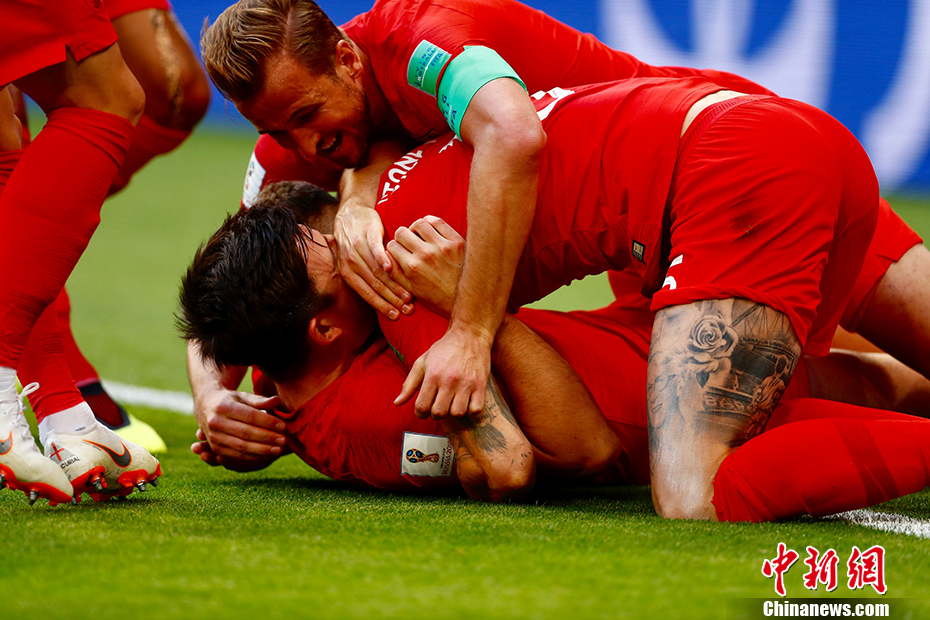 第29分钟,场上僵局被打破,阿什利-杨开出左侧角球,后卫马奎尔力压防守队员高高跃起将球砸向大门,瑞典门将扑救不及,英格兰1:0取得领先。图为英格兰队庆祝进球。 中新社记者 富田 摄