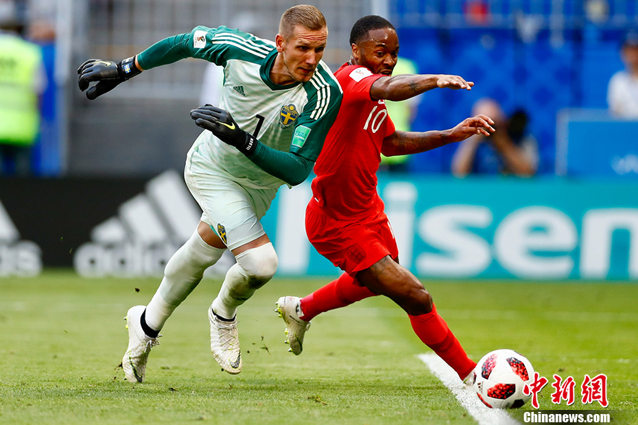 半场结束前,英格兰队再次制造杀机。亨德森在中圈送出精准地长传球直接找到了前面的斯特林,他晃过门将后抬起右脚射门,结果被瑞典后卫挡出底线,“三狮军团”错过扩大领先优势的机会。 中新社记者 富田 摄