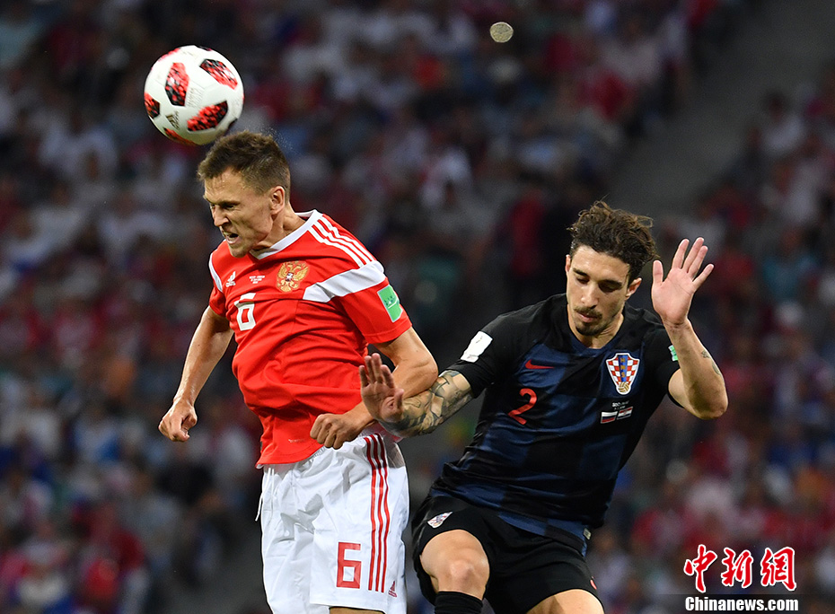 第31分钟,俄罗斯队打破场上僵局!高中锋久巴和切里舍夫在前场做配合,切里舍夫得球后用左脚突施冷箭,皮球直挂球门左上角入网,克罗地亚门将苏巴西奇毫无反应。图为切里舍夫头球。 中新社记者 毛建军 摄