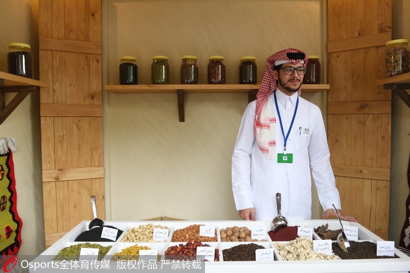 卡塔尔工作人员在卡塔尔世界杯展览开幕式上展开卡塔尔当地特产