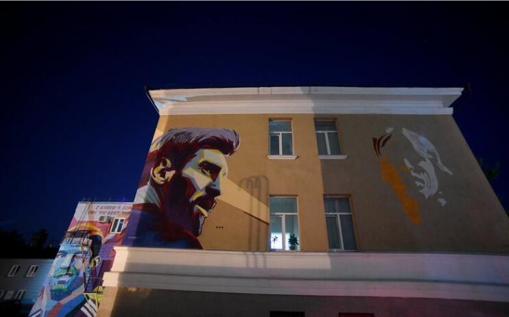 俄罗斯艺术家街头绘制球星画作 墙壁熠熠生辉