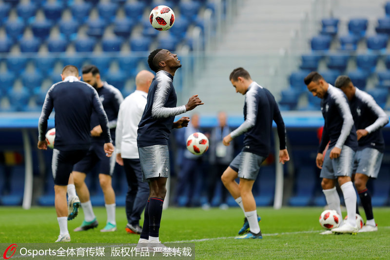 人民网北京7月10日电(欧兴荣 实习生 沈思莹)北京时间7月9日,法国队球员在俄罗斯圣彼得堡进行赛前训练,德尚携洛里斯出席新闻发布会。高卢雄鸡法国队将于北京时间7月11日凌晨2点对阵欧洲红魔比利时队。(Osports全体育传媒专供人民体育 版权作品 严禁转载)