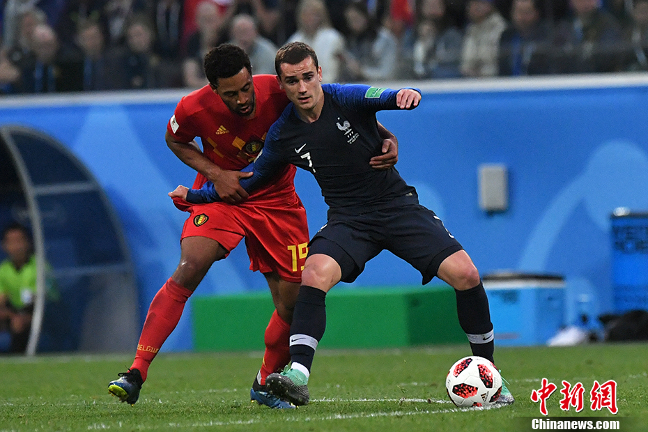 全场比赛结束,最终凭借乌姆蒂蒂的进球,“高卢雄鸡”1:0战胜“欧洲红魔”,成为第一支晋级决赛的队伍。他们将与英格兰与克罗地亚的胜者争夺大力神杯。图为格里兹曼同登贝莱拼抢。 中新社记者 田博川 摄