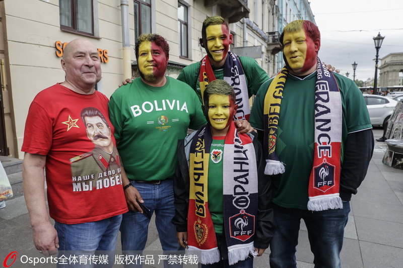 人民网北京7月10日电(赵欣悦) 北京时间7月11日2时,2018俄罗斯世界杯将展开首场半决赛的较量,两支夺冠热门法国与比利时下路相逢。赛前,两队球迷已准备就绪,他们齐聚在圣彼得堡球场外,为自己画上国旗脸,全力以赴为自己国家的球队呐喊助威。(Osports全体育传媒专供人民体育 版权作品 严禁转载)
