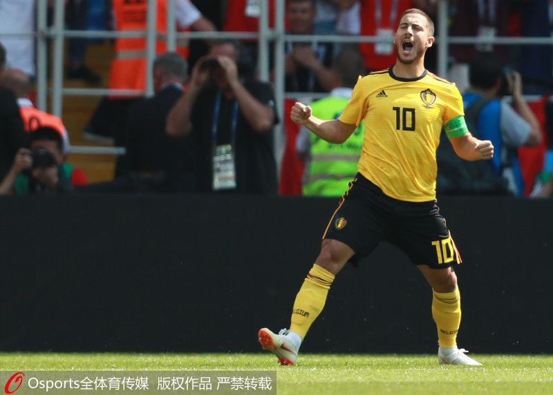 小组赛第二场5:2战胜突尼斯,阿扎尔庆祝进球