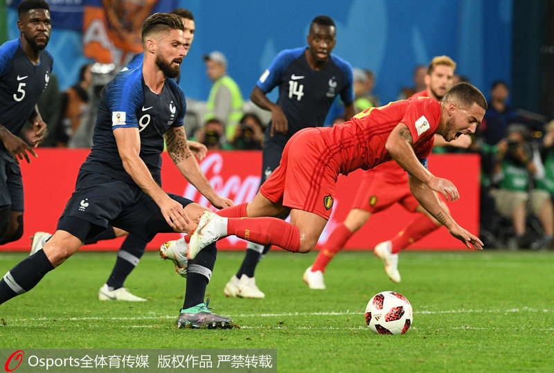 人民网北京7月11日电(欧兴荣 实习生邓方佳)北京时间今日凌晨,比利时与法国的首场半决赛率先结束。凭借着乌姆蒂蒂的进球,法国1:0小胜比利时,闯入决赛。而比利时的世界杯之旅尚未结束,他们将在北京时间7月14日22:00,与另一场半决赛的负者进行季军争夺战。(Osports全体育传媒专供人民体育 版权作品 严禁转载)