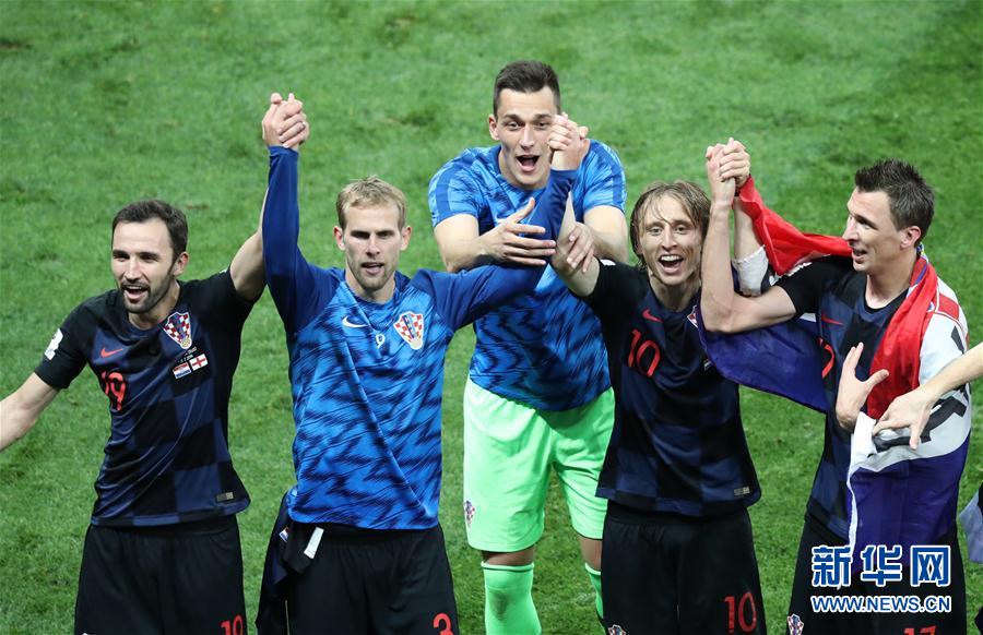 7月11日,克罗地亚队球员赛后庆祝胜利。当日,在莫斯科进行的2018俄罗斯世界杯足球赛半决赛中,克罗地亚队与英格兰队在90分钟内战成1比1平。最终,克罗地亚队经过加时赛以2比1战胜英格兰队,历史上首次晋级世界杯决赛。新华社记者白雪骐摄