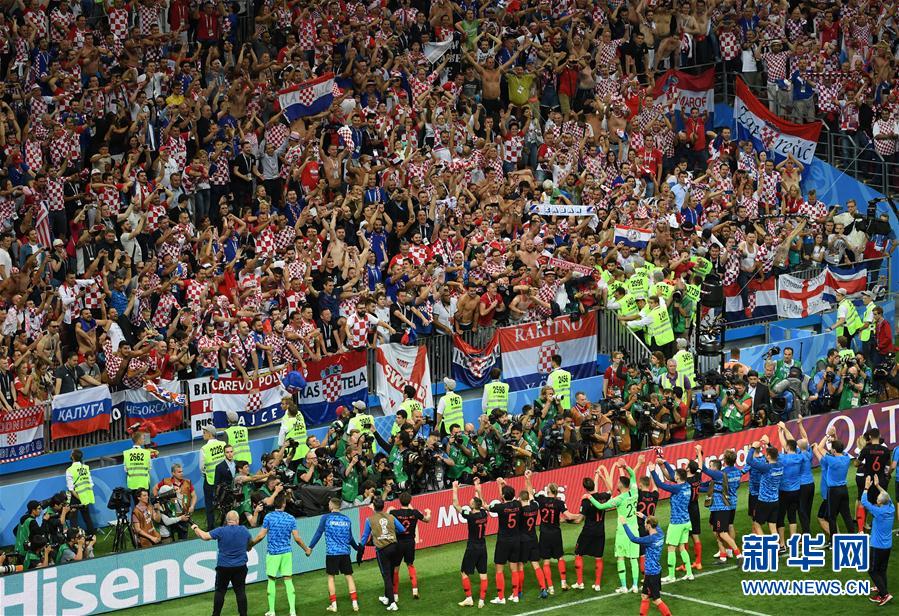 7月11日,克罗地亚队球员在比赛后向球迷致意。当日,在莫斯科进行的2018俄罗斯世界杯足球赛半决赛中,克罗地亚队与英格兰队在90分钟内战成1比1平。最终,克罗地亚队经过加时赛以2比1战胜英格兰队,历史上首次晋级世界杯决赛。新华社记者王毓国摄