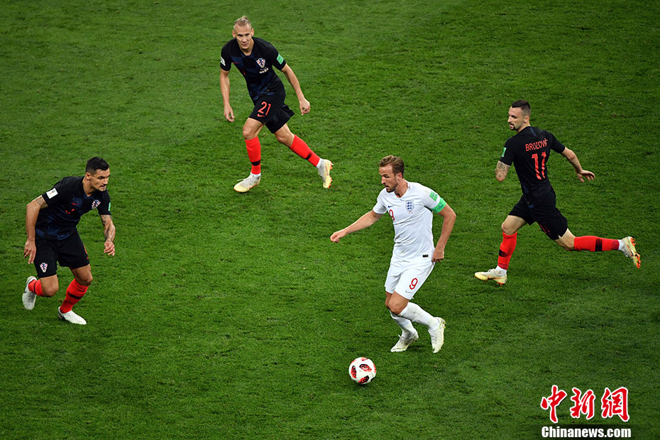 北京时间7月12日凌晨,2018俄罗斯世界杯第二场半决赛在莫斯科卢日尼基球场展开较量,由“三狮军团”英格兰对阵“格子军团”克罗地亚。英格兰队特里皮尔“圆月弯刀”破门,佩里西奇门前垫射扳平,常规时间内两支队伍1:1战平。加时赛中,凭借曼朱基奇的破门,克罗地亚队2:1战胜英格兰挺进决赛,创造历史的他们将与“高卢雄鸡”争夺大力神杯。 中新社记者 毛建军 摄