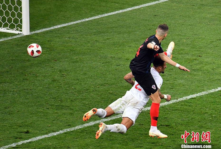 本届世界杯上,下半场开场15分钟以内多次改写比分,本场比赛也不例外。第68分钟,克罗地亚队获得前场进攻机会,拉基蒂奇左侧大范围转移,弗尔萨利科右路斜传,埋伏在后点的佩里西奇突然插上,把球踹进了球门,1:1,克罗地亚扳平比分。 中新社记者 毛建军 摄