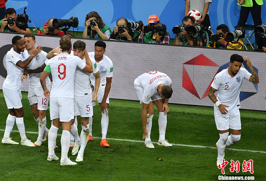 英格兰队庆祝进球。 中新社记者 毛建军 摄