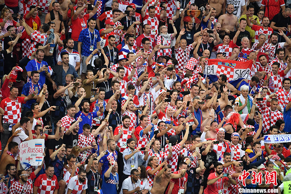 看台上激动的克罗地亚球迷,俨然“格子海洋”。 中新社记者 毛建军 摄
