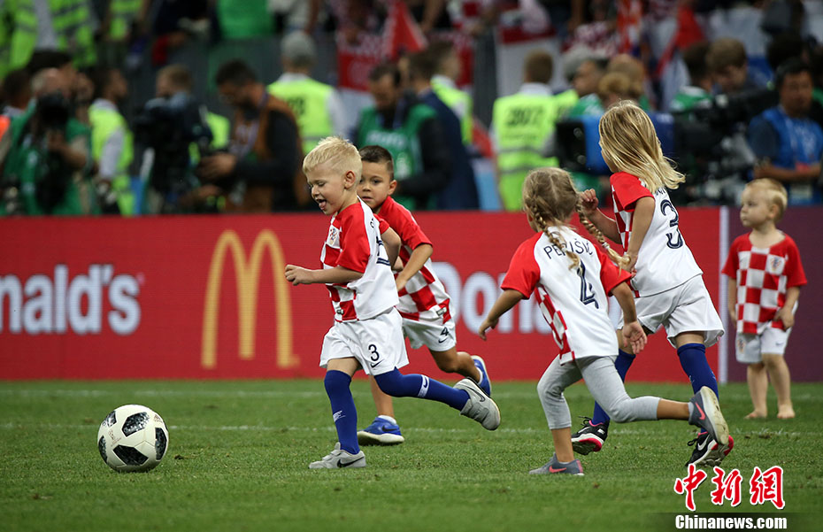 比赛结束后,几名克罗西亚小朋友走上绿茵场,开始了又一场“大战”。 钟欣 摄