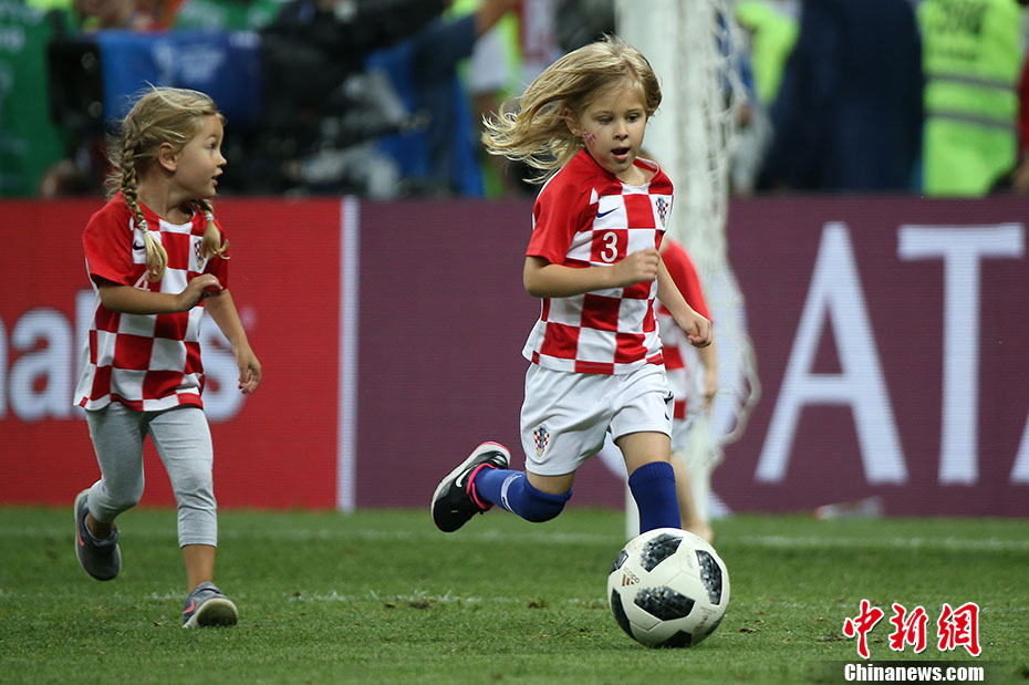 比赛结束后,几名克罗西亚小朋友走上绿茵场,开始了又一场“大战”。 钟欣 摄