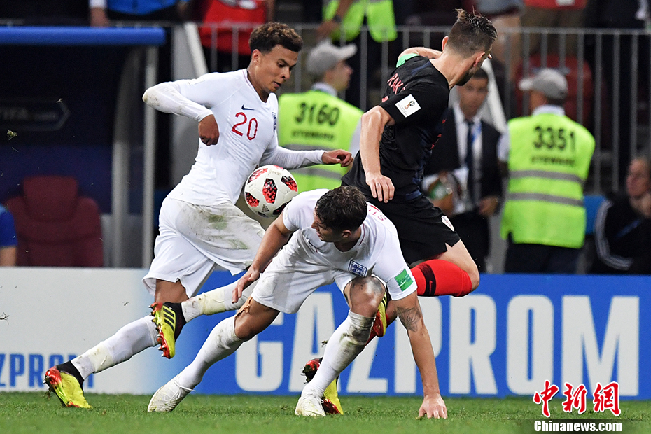 北京时间7月12日凌晨,2018俄罗斯世界杯第二场半决赛在莫斯科卢日尼基球场展开较量,由“三狮军团”英格兰对阵“格子军团”克罗地亚。英格兰队特里皮尔“圆月弯刀”破门,佩里西奇门前垫射扳平,常规时间内两支队伍1:1战平。加时赛中,凭借曼朱基奇的破门,克罗地亚队2:1战胜英格兰挺进决赛,创造历史的他们将与“高卢雄鸡”争夺大力神杯。 中新社记者 田博川 摄