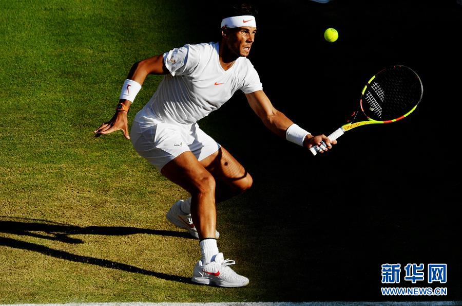 7月11日,纳达尔在比赛中回球。当日,在英国伦敦举行的2018温布尔登网球公开赛男单四分之一决赛中,西班牙选手纳达尔以3比2战胜阿根廷选手德尔波特罗,晋级四强。新华社记者郭求达摄