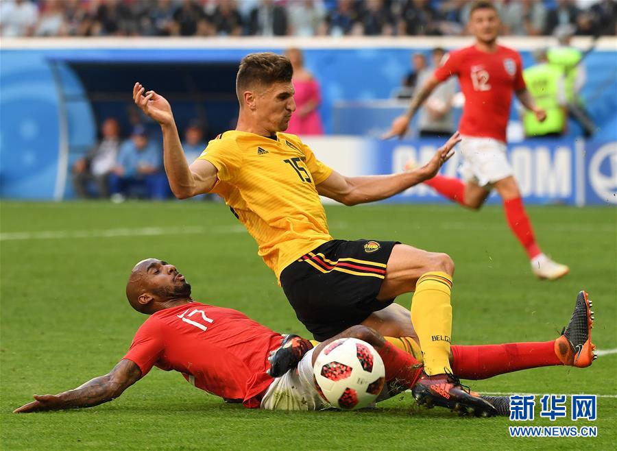 7月14日,英格兰队球员德尔夫(下)与比利时队球员穆尼耶在比赛中拼抢。当日,在圣彼得堡进行的2018俄罗斯世界杯足球赛三四名决赛中,比利时队以2比0战胜英格兰队,夺得季军。这是比利时队的世界杯历史最佳战绩。新华社记者 李尕 摄