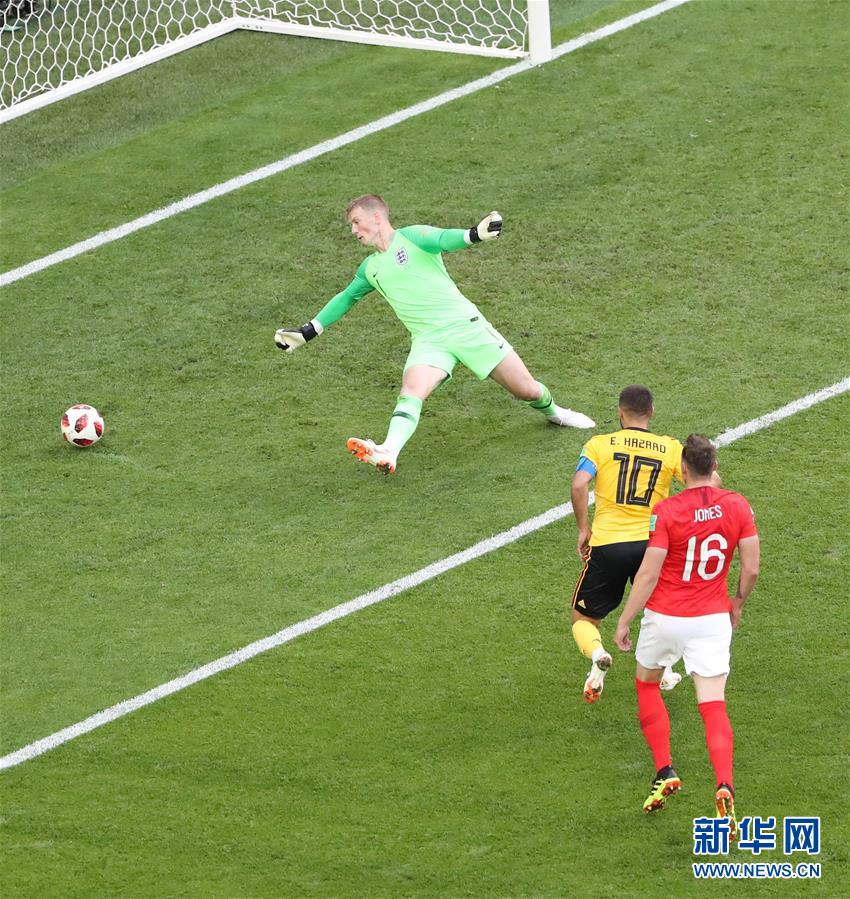 7月14日,比利时队球员埃·阿扎尔(中)在比赛中射门得分。当日,在圣彼得堡进行的2018俄罗斯世界杯足球赛三四名决赛中,比利时队以2比0战胜英格兰队,夺得季军。这是比利时队的世界杯历史最佳战绩。新华社记者 李明 摄