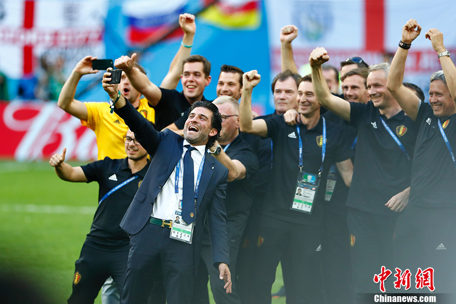 比利时队教练组和队员自拍合影。 中新社记者 富田 摄