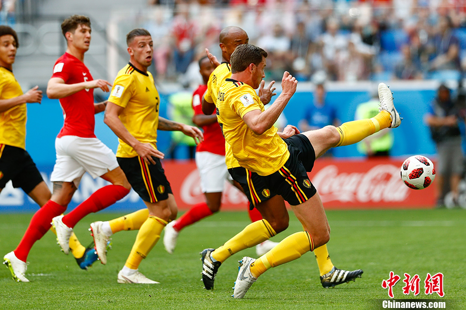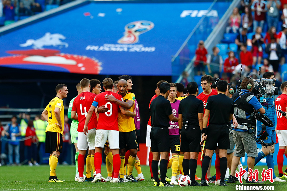 这是两支球队在本届世界杯上的第二次碰撞,也是世界杯历史上首次由来自同一个小组的队伍争夺三四名。在之前的小组赛碰面中,比利时凭借亚努扎伊的进球1球小胜英格兰。本场比赛堪称世界杯版本的“英超全明星赛”,英格兰队23名球员全都来自英超联赛,而比利时大名单23人中的11人在英超效力。 中新社记者 富田 摄