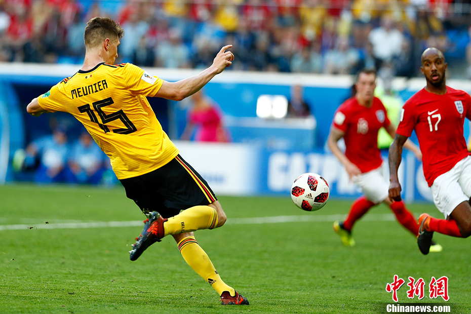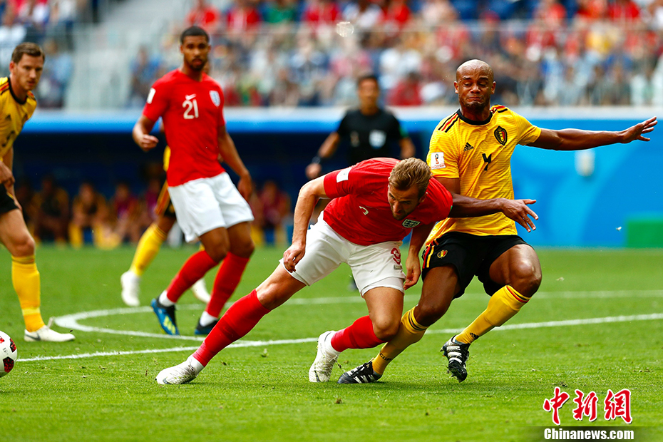 第22分钟,英格兰队获得全场最佳机会,斯特林在禁区内拿球回传,凯恩迎球打门但足球滑门而出。随后双方陷入僵持,比利时几次反击颇具威胁,但未能扩大比分。英格兰队也有多次射正机会,但也没有取得进球。 中新社记者 富田 摄