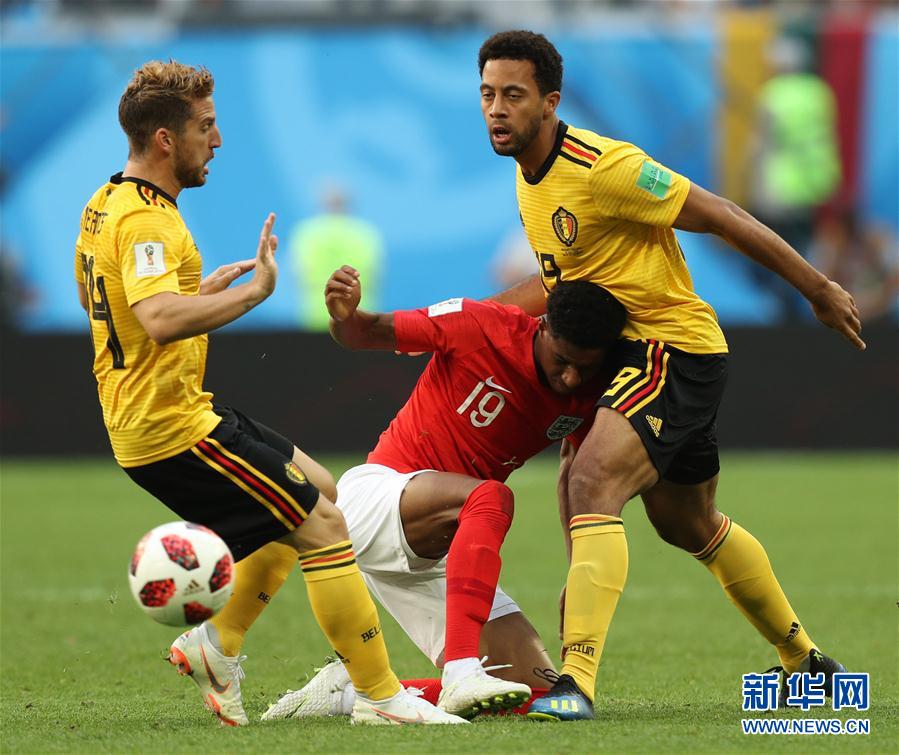 7月14日,比利时队球员穆·登贝莱(右)与英格兰队球员拉什福德(下)在比赛中拼抢。当日,在圣彼得堡进行的2018俄罗斯世界杯足球赛三四名决赛中,比利时队以2比0战胜英格兰队,夺得季军。这是比利时队的世界杯历史最佳战绩。新华社记者鲁金博摄