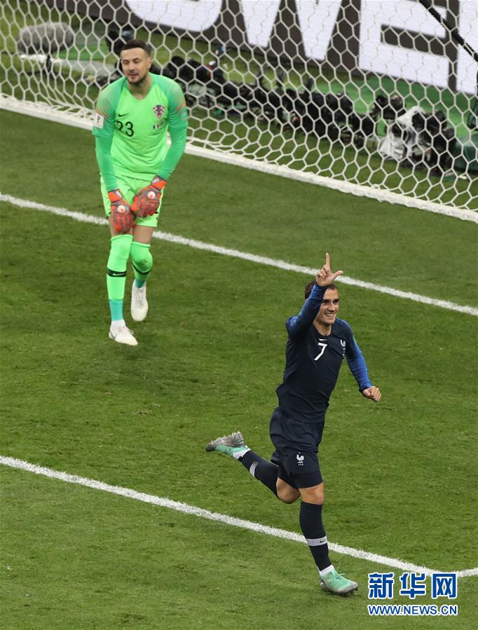 7月15日,法国队球员格列兹曼(下)在比赛中庆祝进球。 当日,在莫斯科进行的2018俄罗斯世界杯足球赛决赛中,克罗地亚队对阵法国队。新华社记者徐子鉴摄