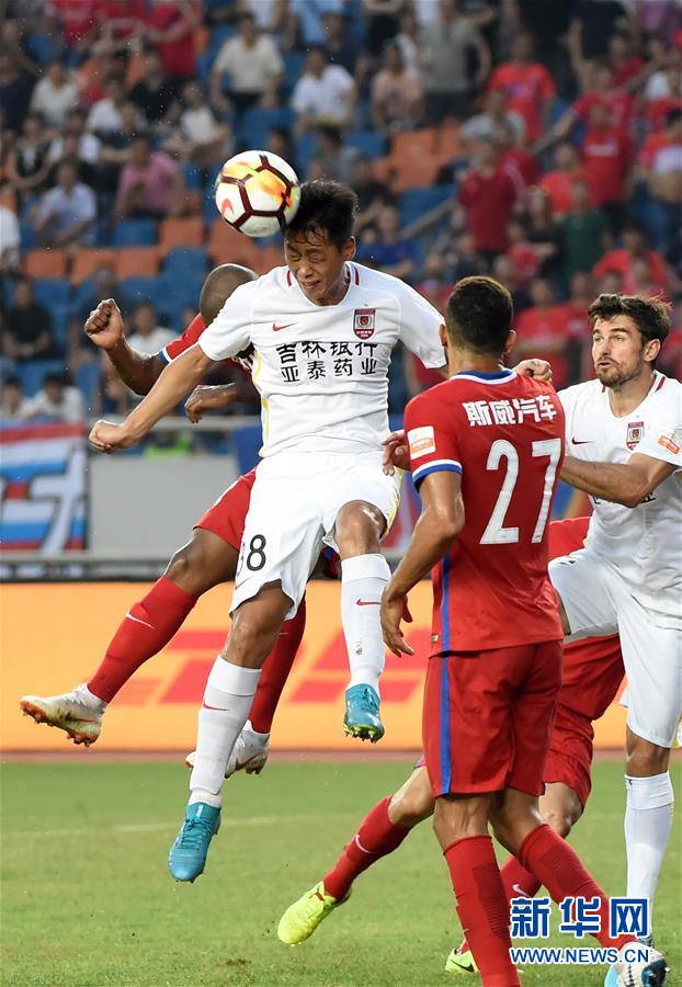 ↑7月17日,长春亚泰队球员王寿挺(左二)在禁区内头球解围。 当日,在2018赛季中超联赛第12轮比赛中,重庆斯威队主场迎战长春亚泰队。 新华社记者唐奕摄