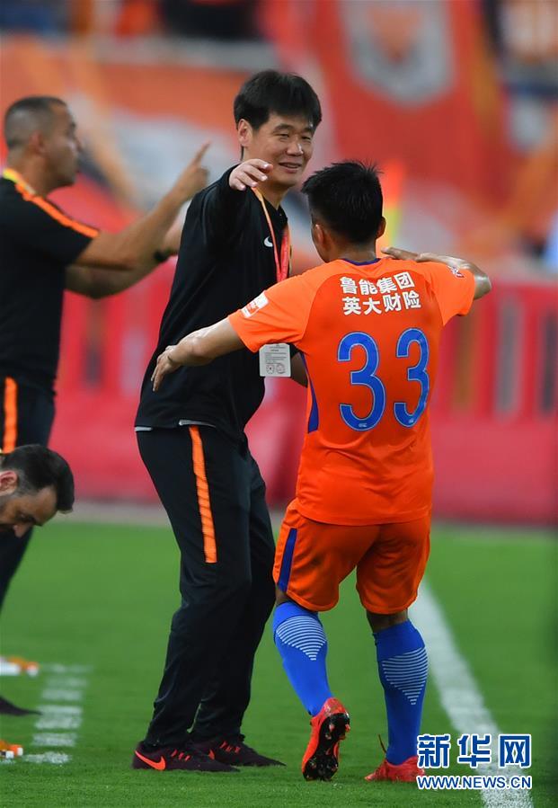 ↑7月17日,山东鲁能泰山队球员金敬道(右)在比赛中和主教练李霄鹏(右二)庆祝进球。 当日,在2018赛季中超联赛第12轮比赛中,山东鲁能泰山队主场迎战上海上港队。 新华社记者朱峥摄