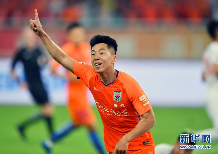 ↑7月17日,山东鲁能泰山队球员金敬道在比赛中庆祝进球。 当日,在2018赛季中超联赛第12轮比赛中,山东鲁能泰山队主场迎战上海上港队。 新华社记者朱峥摄
