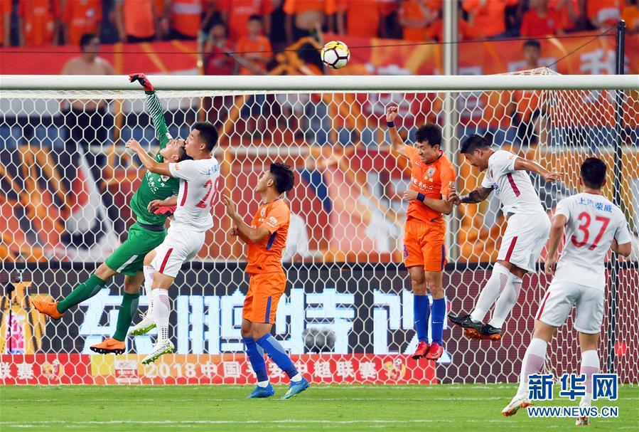 ↑7月17日,山东鲁能泰山队守门员王大雷(左一)在比赛中扑救。 当日,在2018赛季中超联赛第12轮比赛中,山东鲁能泰山队主场迎战上海上港队。 新华社记者朱峥摄