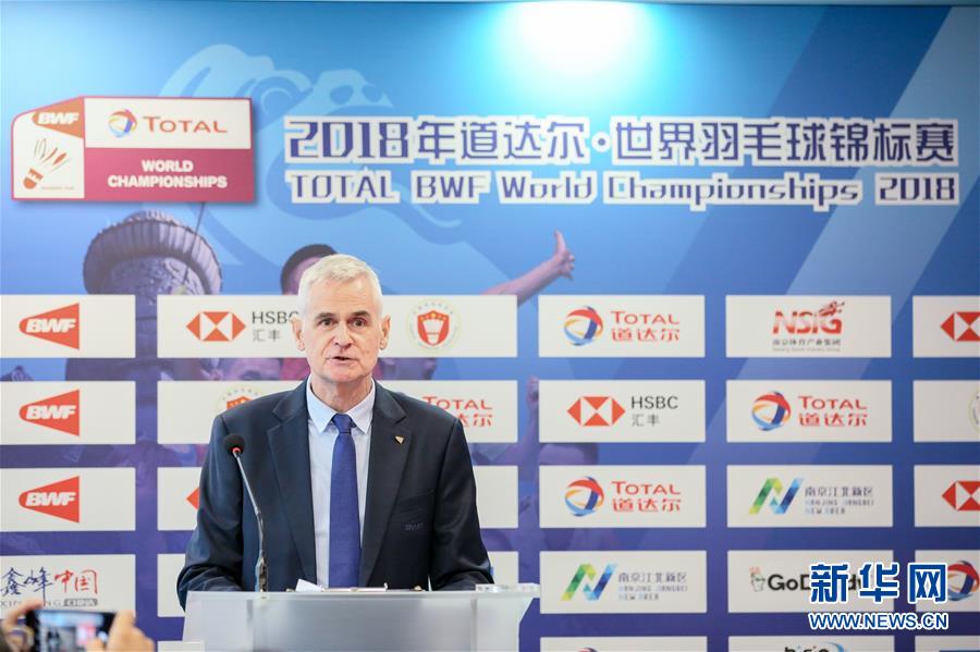 ↑7月17日,国际羽联首席运营官斯图尔特·博里在抽签仪式上讲话。 当日,2018年羽毛球世锦赛抽签仪式在马来西亚吉隆坡举行。本届羽毛球世锦赛将于7月30日到8月5日在中国南京举行。 新华社记者朱炜摄