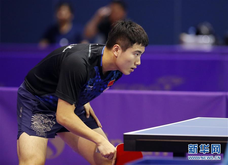 ↑7月17日,梁靖崑在比赛中。 当日,在韩国大田举行的2018国际乒联世界巡回赛韩国公开赛资格赛中,中国选手梁靖崑以4比0战胜韩国选手金优镇。 新华社记者王婧嫱摄
