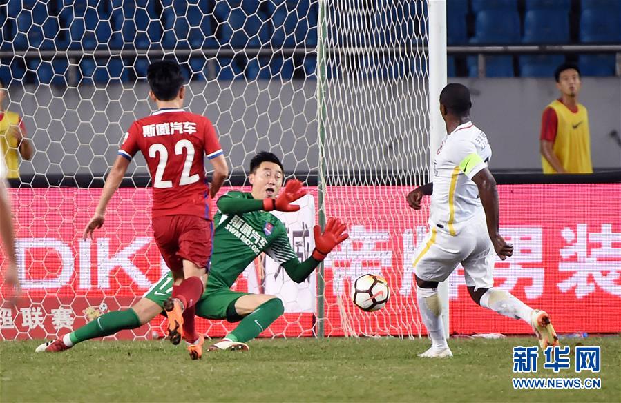 ↑7月17日,重庆斯威队门将隋维杰(中)在比赛中飞身扑救。新华社记者唐奕摄