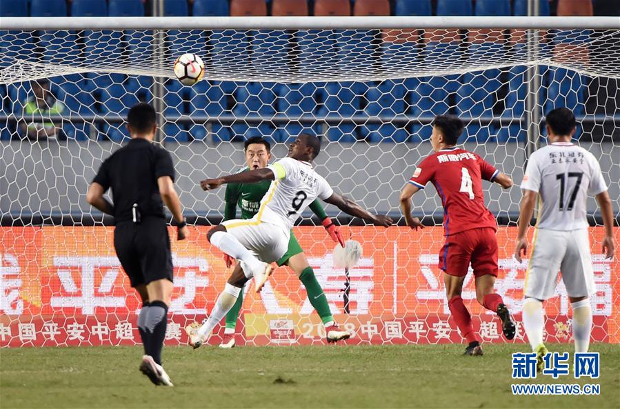 ↑7月17日,长春亚泰队球员伊哈洛(中)在禁区内起脚射门。新华社记者唐奕摄