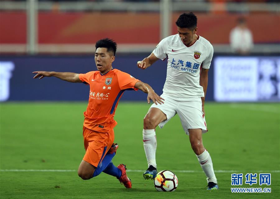 ↑7月17日,山东鲁能泰山队球员金敬道(左)在比赛中摔倒。 当日,在2018赛季中超联赛第12轮比赛中,山东鲁能泰山队主场以1比1战平上海上港队。 新华社记者朱峥摄