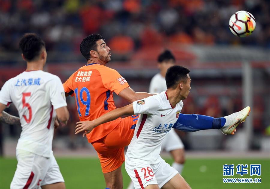 ↑7月17日,山东鲁能泰山队球员佩莱(中)在比赛中控球。 当日,在2018赛季中超联赛第12轮比赛中,山东鲁能泰山队主场以1比1战平上海上港队。 新华社记者朱峥摄