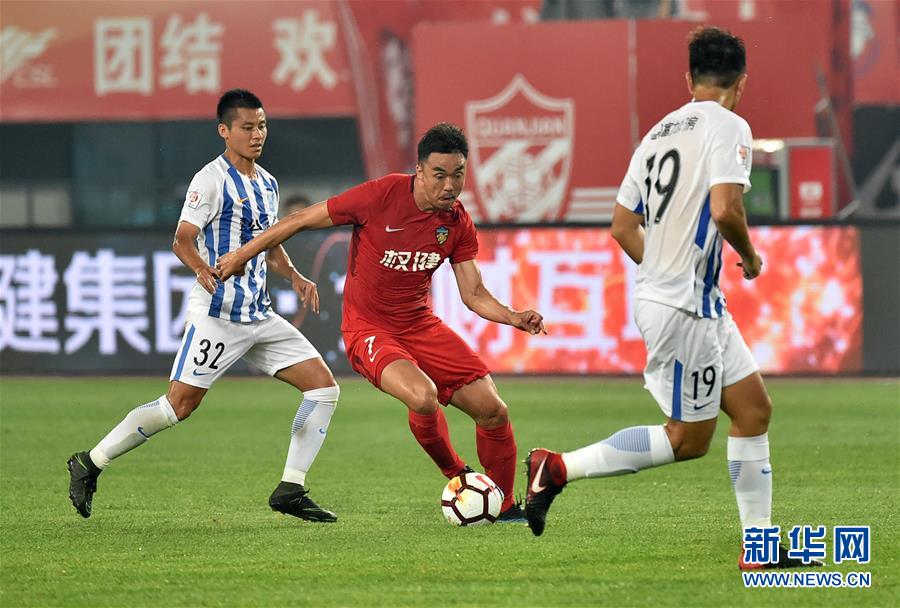 ↑7月17日,天津权健队球员赵旭日(中)在比赛中突破。 当日,在2018赛季中超联赛第12轮比赛中,天津权健队主场以2比1战胜广州富力队。 新华社记者李然摄