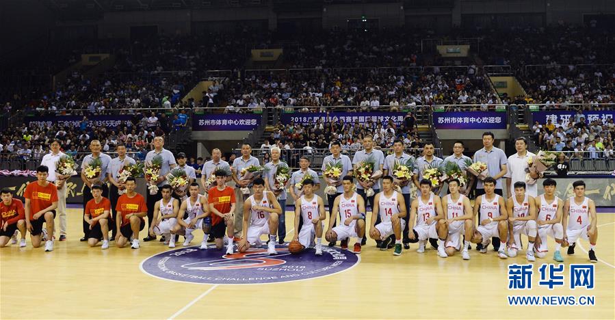 ↑7月17日,中国国奥队球员与前辈们及嘉宾合影。 当日,2018八国男篮争霸赛A组比赛在江苏苏州举行。中国国奥队以62比65不敌德国国家队。在比赛间隙,曾创造首次打进奥运会八强历史的中国男篮“黄金一代”亮相赛场。 新华社记者季春鹏摄