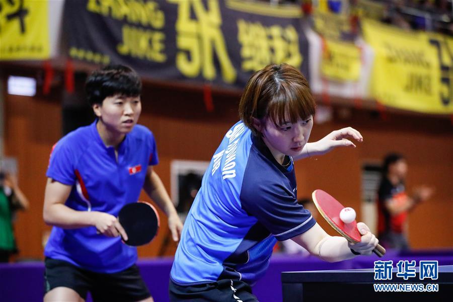 ↑7月18日,韩国选手徐孝元(右)和朝鲜选手金宋依在比赛中。 当日,在韩国大田举行的2018国际乒联世界巡回赛韩国公开赛资格赛女双第一轮比赛中,韩国选手徐孝元和朝鲜选手金宋依以3比0战胜乌兹别克斯坦组合奥尔加/雷吉娜。 新华社记者王婧嫱摄