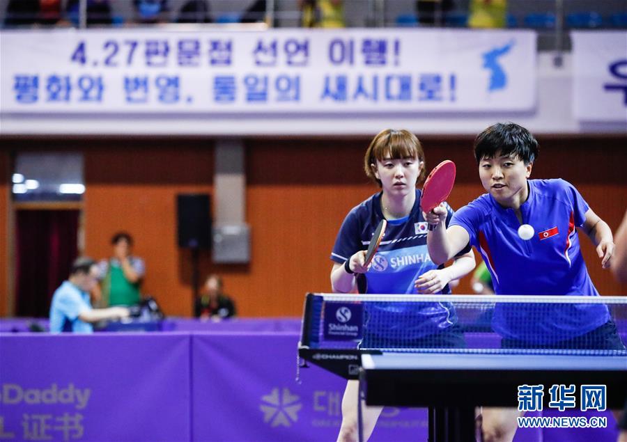 ↑7月18日,韩国选手徐孝元(左)和朝鲜选手金宋依在比赛中。 当日,在韩国大田举行的2018国际乒联世界巡回赛韩国公开赛资格赛女双第一轮比赛中,韩国选手徐孝元和朝鲜选手金宋依以3比0战胜乌兹别克斯坦组合奥尔加/雷吉娜。 新华社记者王婧嫱摄