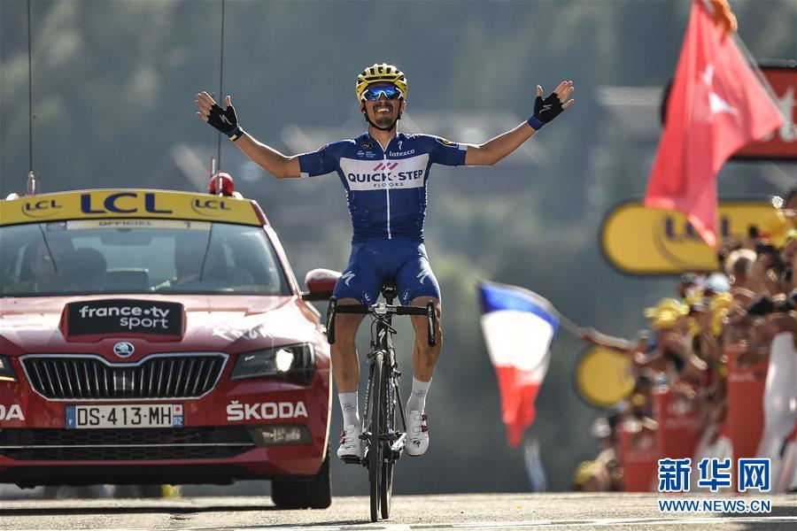 ↑7月17日,快步车队车手阿拉菲利普庆祝抵达终点。 当日,2018环法自行车赛结束了第十赛段从阿讷西至大博尔南全长158.5公里的争夺,快步车队车手阿拉菲利普以4小时25分27秒的成绩获得本赛段冠军,BMC车队车手范阿韦马特连续第七天保有领骑黄衫。 新华社/法新