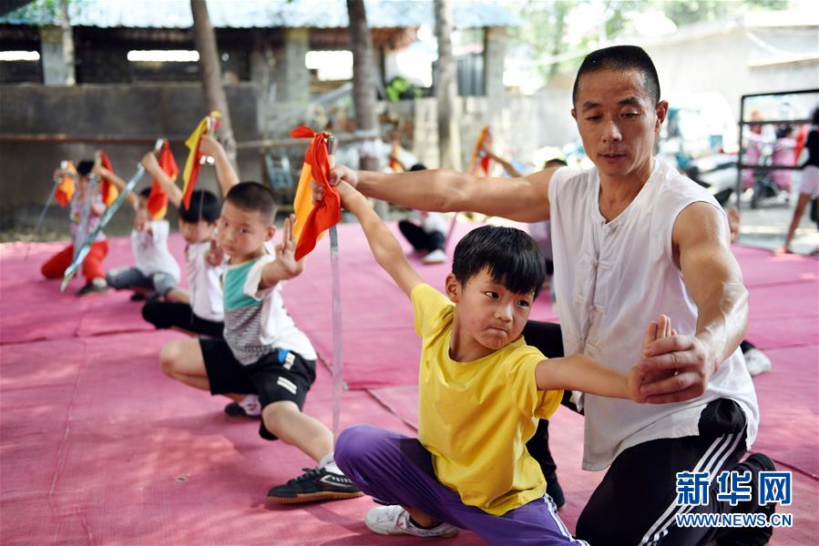↑7月18日,在山东省临沂市郯城县马头镇一家武术俱乐部,教练马坤朋在指导孩子们练习刀术。 暑假期间,各地的孩子们参与丰富多彩的活动,健康快乐过暑假。 新华社发(房德华 摄)