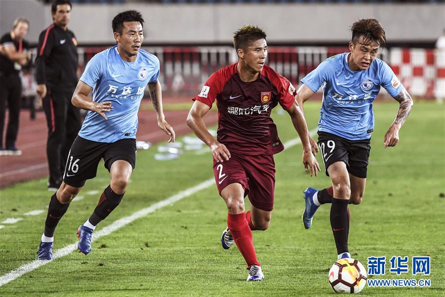 ↑7月18日,河北华夏幸福队球员赵明剑(前中)在比赛中带球突破。 当日,在2018赛季中超联赛第12轮比赛中,大连一方队主场以0比0战平河北华夏幸福队。 新华社记者潘昱龙摄