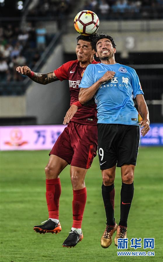 ↑7月18日,大连一方队球员盖坦(右)在比赛中争抢头球。 当日,在2018赛季中超联赛第12轮比赛中,大连一方队主场以0比0战平河北华夏幸福队。 新华社记者潘昱龙摄