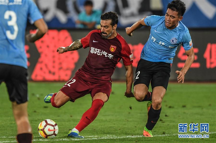 ↑7月18日,河北华夏幸福队球员拉维奇(中)在比赛中射门。 当日,在2018赛季中超联赛第12轮比赛中,大连一方队主场以0比0战平河北华夏幸福队。 新华社记者潘昱龙摄