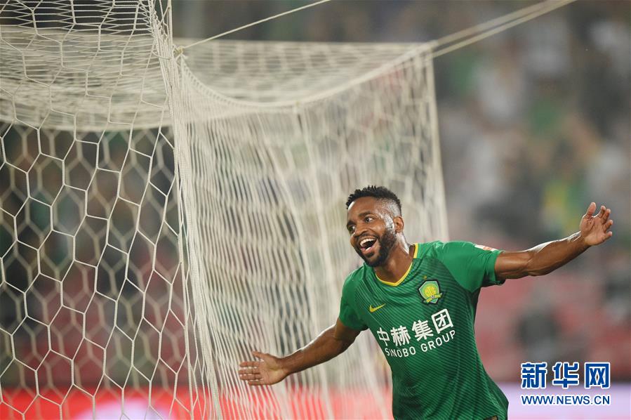 ↑7月18日,北京国安队球员巴坎布在比赛中庆祝进球。 当日,在2018赛季中超联赛第12轮比赛中,北京国安队主场以2比1战胜河南建业队。 新华社记者鞠焕宗摄