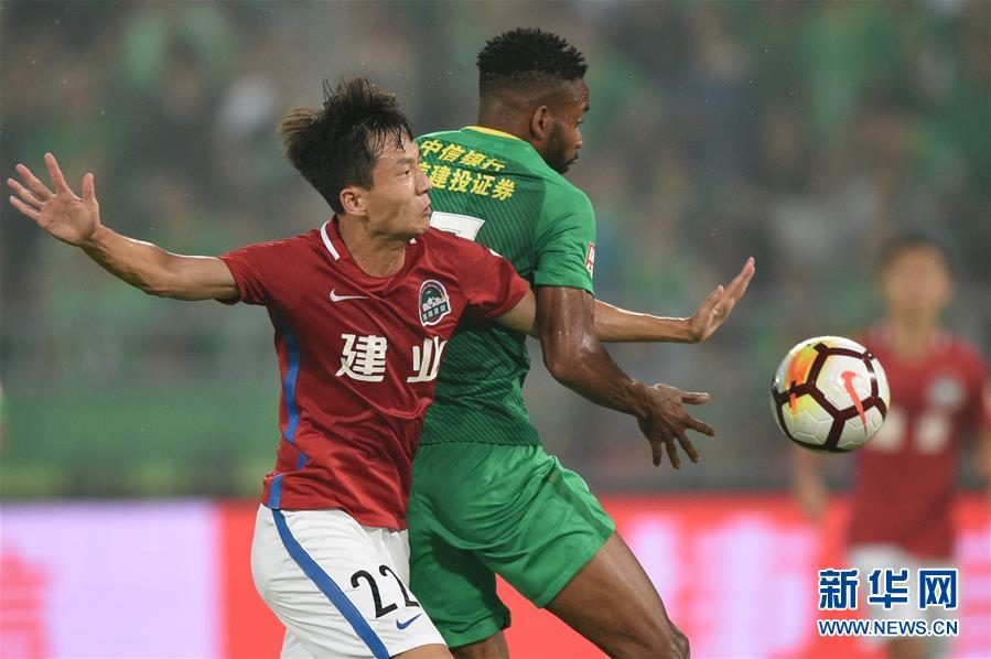 ↑7月18日,河南建业队球员龙威(左)在比赛中防守北京国安队球员巴坎布。 当日,在2018赛季中超联赛第12轮比赛中,北京国安队主场以2比1战胜河南建业队。 新华社记者鞠焕宗摄