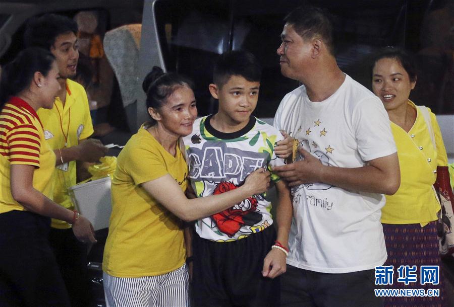 ↑7月18日,在泰国清莱,家属拥抱从被困山洞中获救的少年足球队员。新华社/美联