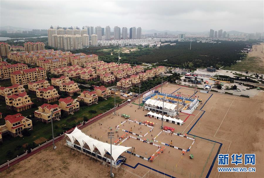 ↑7月19日,比赛在风景优美的海阳金沙滩举行(无人机拍摄)。 当日,2018国际排联世界沙滩排球巡回赛海阳公开赛在山东海阳继续进行。中国男子选手高鹏、李阳组合在当日比赛中以2比1战胜法国组合晋级下一轮。 新华社记者朱峥摄